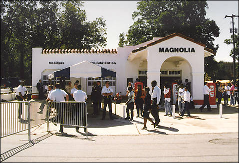 Center in the other direction is a historic Mobil gas station, which